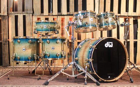 DW Collector's Cherry Spruce Carl Allen Blue Burst over Quilted Moabi Exotic Drum Set